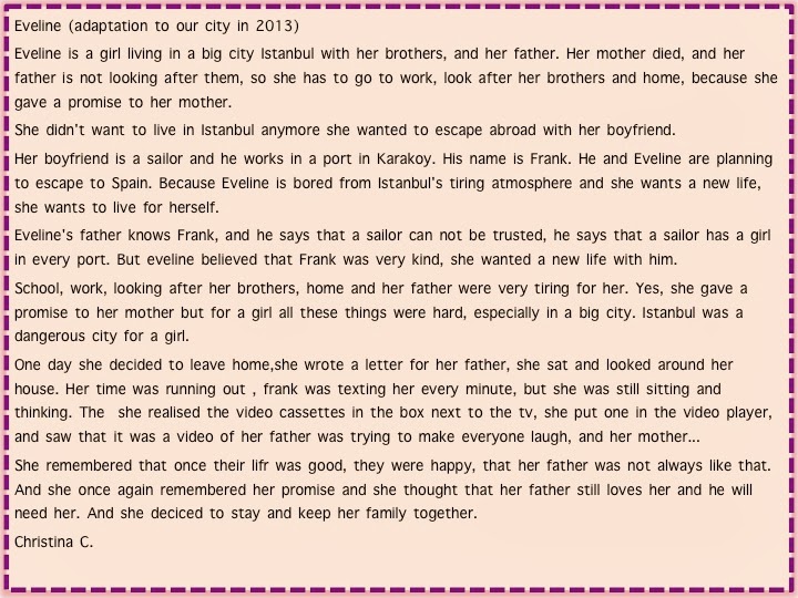 One of the stories I love revisiting is Eveline from Dubliners. This year with my year 12 students we read it again. I’d like to share the follow-up activities we did. I grouped the students and assigned them with one task. They chose one and created the followings.